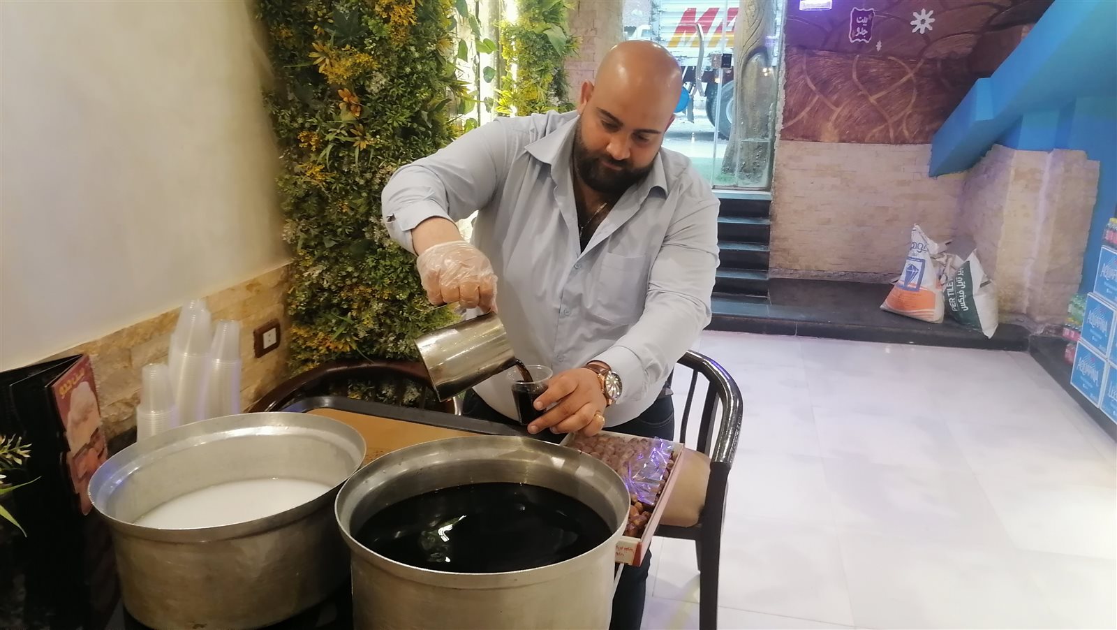 مينا يبدأ بصحبة العاملين معه في الكافيه وتملأهم الفرحة عند مشاركته قبيل أذان المغرب بساعات في تجهيز التمر والسوبيا والبلح لإفطار الصائمين في الشوارع.
