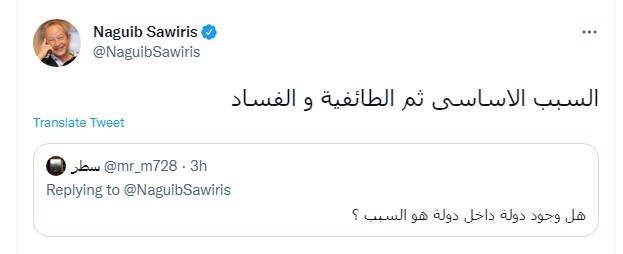 وأرجع ساويرس أن سبب إعلان الحكومة اللبنانية إفلاس الدولة ومصرف لبنان يعود لوجود دولة داخل الدولة، مع الطائفية والفساد.