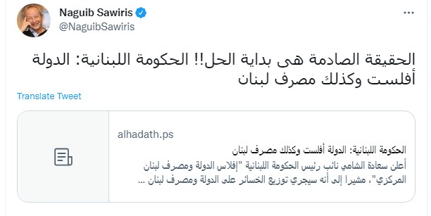 وكتب نجيب ساويرس تغريدة على تويتر: "الحقيقة الصادمة هي بداية الحل!! الحكومة اللبنانية: الدولة أفلست وكذلك مصرف لبنان".