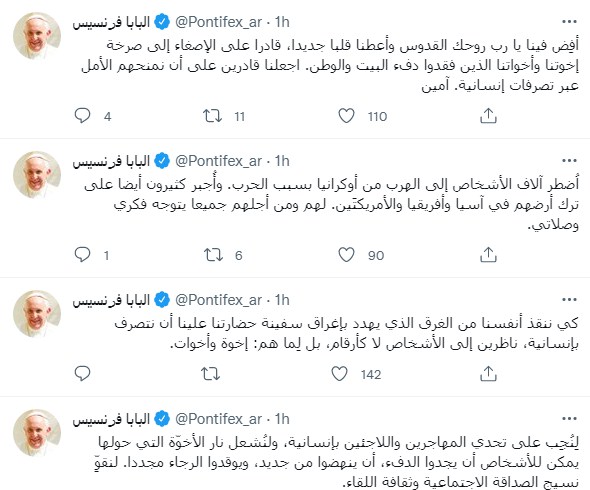 وأضاف "اُضطر آلاف الأشخاص إلى الهرب من أوكرانيا بسبب الحرب. وأُجبر كثيرون أيضا على ترك أرضهم في آسيا وأفريقيا والأمريكتَين. لهم ومن أجلهم جميعا يتوجه فكري وصلاتي."