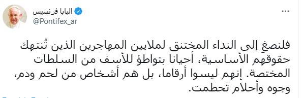 وكتب البابا فرنسيس تغريدة على تويتر "لِنُجِب على تحدي المهاجرين واللاجئين بإنسانية، ولنُشعل نار الأخوّة التي حولها يمكن للأشخاص أن يجدوا الدفء، أن ينهضوا من جديد، ويوقدوا الرجاء مجددا. لنقوِّ نسيج الصداقة الاجتماعية وثقافة اللقاء".
