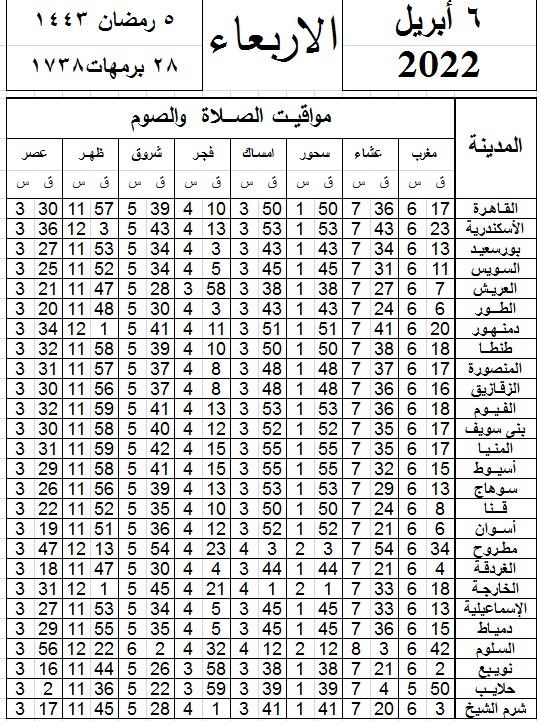 وجاءت مواعيد الأذان اليوم في باقي مدن الجمهورية كالتالي: