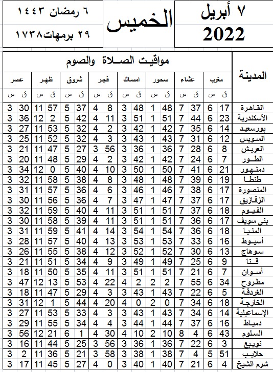 وجاءت مواعيد الأذان اليوم في باقي مدن الجمهورية كالتالي: