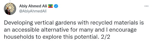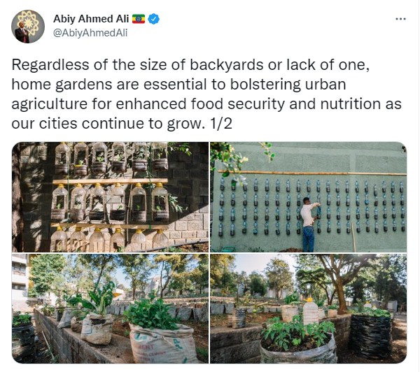 وكتب آبي أحمد تغريدة على تويتر "بغض النظر عن حجم الساحات الخلفية أو عدم وجودها، فإن الحدائق المنزلية ضرورية لتعزيز الزراعة الحضرية لتعزيز الأمن الغذائي والتغذية مع استمرار مدننا في النمو"