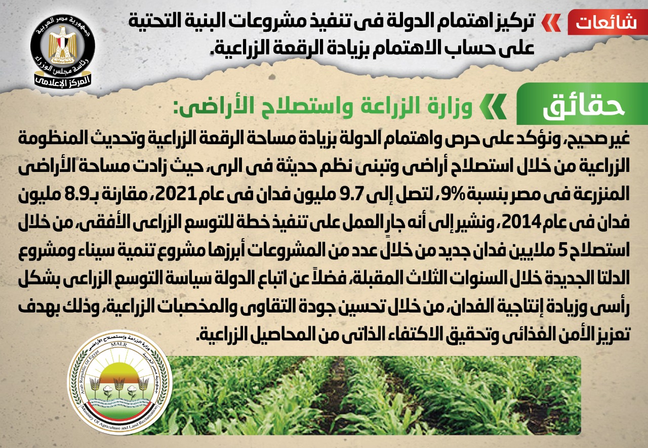 وقد قام المركز الإعلامي لمجلس الوزراء بالتواصل مع وزارة الزراعة واستصلاح الأراضي، والتي نفت تلك الأنباء، مُؤكدةً أنه لا صحة لتركيز اهتمام الدولة في تنفيذ مشروعات البنية التحتية على حساب الاهتمام بزيادة الرقعة الزراعية.