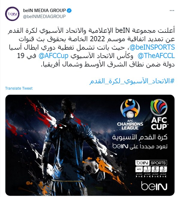 وكتبت مجموعة بي إن سبورت الإعلامية تغريدة على تويتر "أعلنت مجموعة beIN الإعلامية والاتحاد الآسيوي لكرة القدم عن تمديد اتفاقية موسم 2022 الخاصة بحقوق بث قنوات @beINSPORTS، حيث باتت تشمل تغطية دوري ابطال آسيا، @TheAFCCL وكأس الاتحاد الآسيوي، @AFCCup، في 19 دولة ضمن نطاق الشرق الأوسط وشمال أفريقيا."
