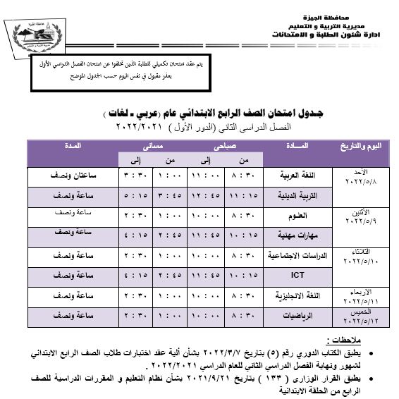 رسميا.. جداول امتحانات الفصل الدراسى الثاني 2022 بمحافظة الجيزة
