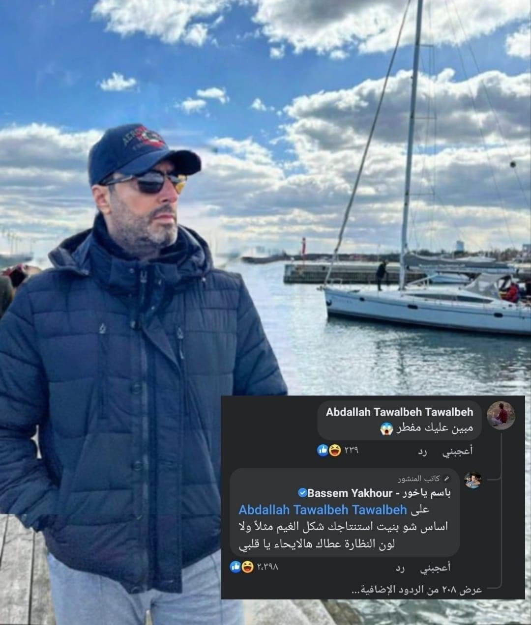 وعلق أحد المتابعين على صورة باسم ياخور قائلا: ”مبين عليك مفطر“، ليرد باسم ياخور على تعليقه قائلا: ”على أساس شو بنيت استنتاجك، شكل الغيم مثلا ولا لون النظارة عطاك هالإيحاء يا قلبي“.