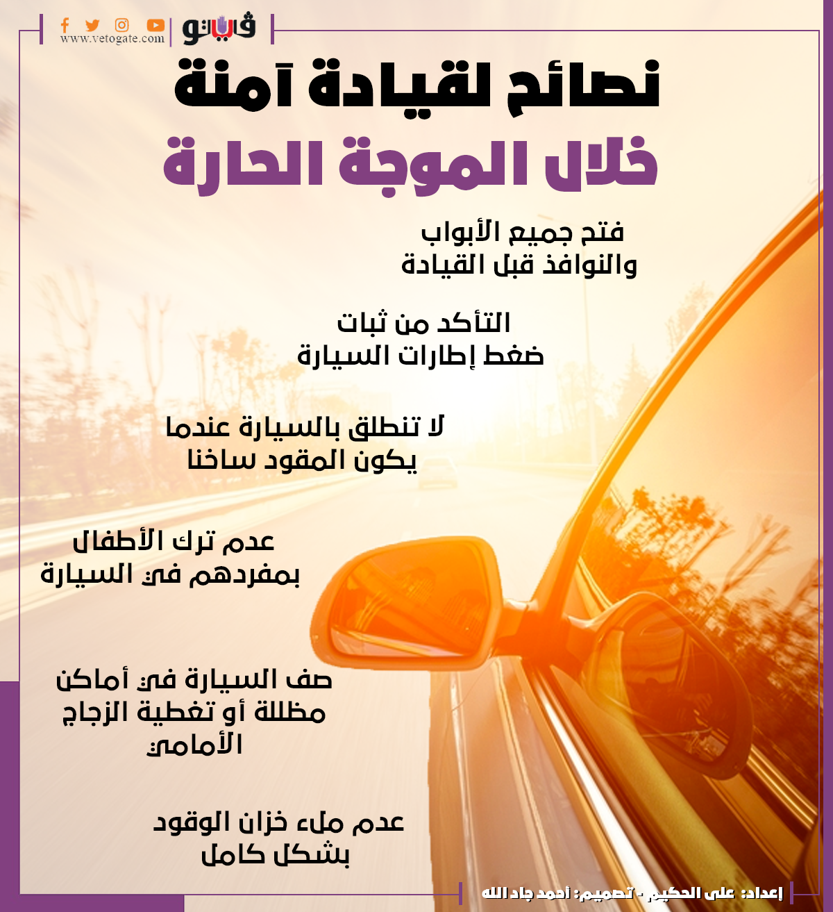 نصائح لقيادة آمنة خلال الموجة الحارة | إنفوجراف الأربعاء 06/أبريل/2022 - 12:56 م 4/6/2022 12:56:00 PM تعبيرية على الحكيم شارك طباعة 18 حجم الخط شارك طباعة الإدارة العامة المرور بدء فصل الصيف بداية فصل الصيف الحوادث