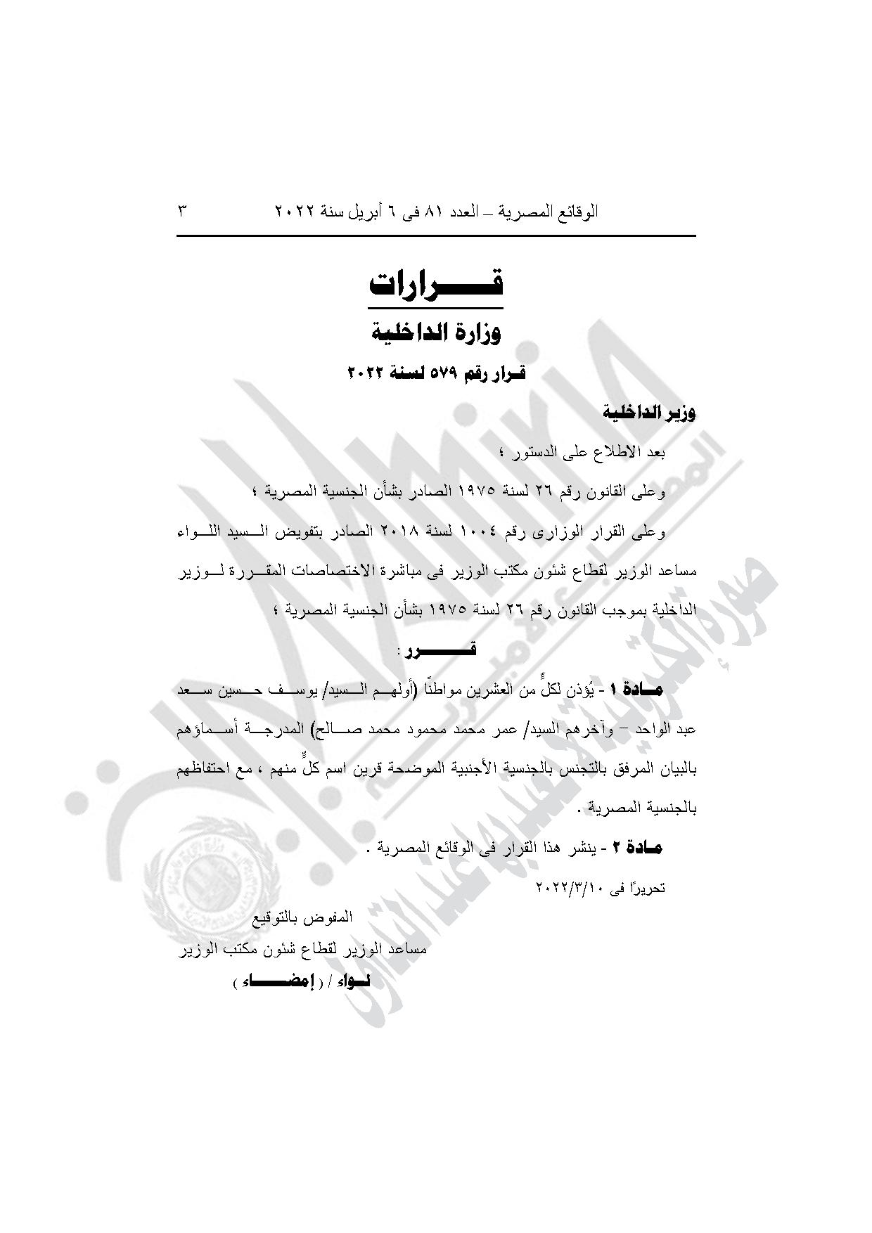 القرار رقم 579 لسنة 2022، بالأذن لكل من العشرين مواطنًا (أولهم يوسف حسين سعد عبد الواحد، وآخرهم عمر محمد محمود محمد صالح) المدرجة أسماؤهم بالبيان، بـ التجنس بالجنسية الأجنبية الموضحة قرين اسم كل منهم، مع احتفاظهم بالجنسية المصرية.