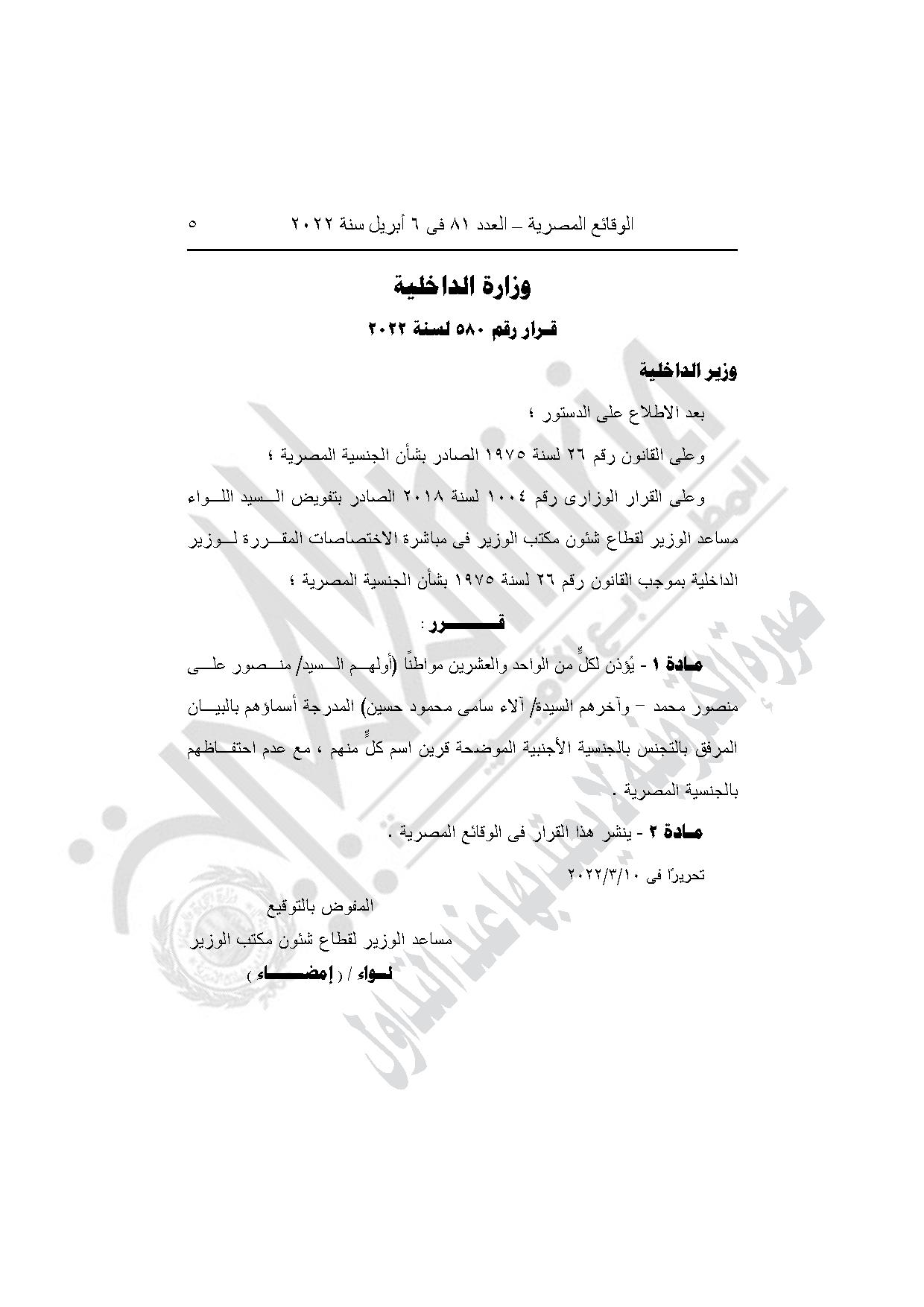 القرار رقم 580 لسنة 2022، بالأذن لكل من الواحد والعشرين مواطنًا (أولهم منصور علي منصور محمد، وآخرهم آلاء سامي محمود حسين) المدرجة أسماؤهم بالبيان، بالتجنس بالجنسية الأجنبية الموضحة قرين اسم كل منهم، مع عدم احتفاظهم بالجنسية المصرية.