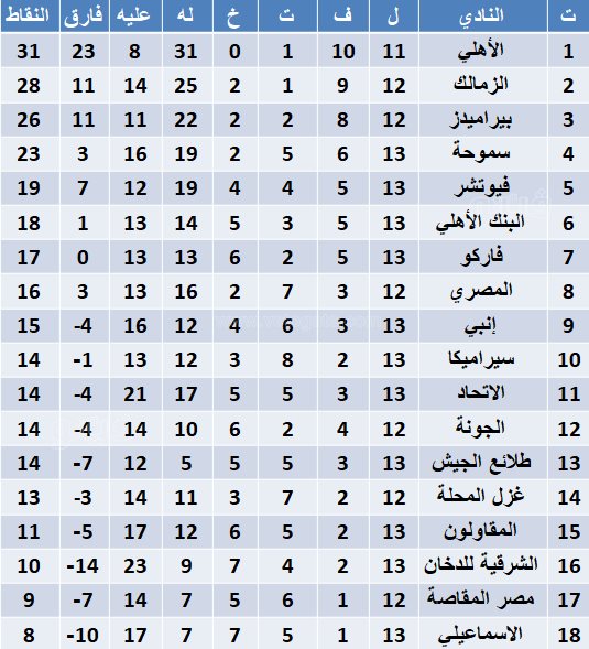 جدول ترتيب الدوري الممتاز بعد فوز الأهلي والزمالك