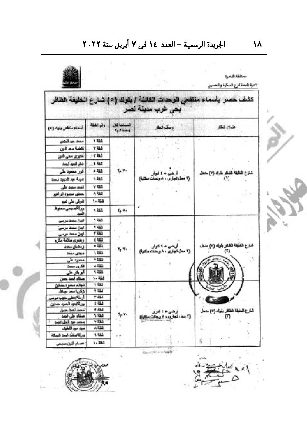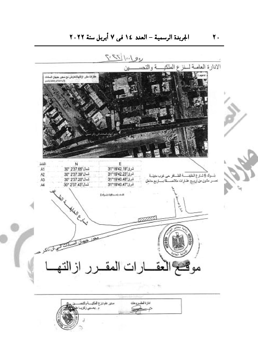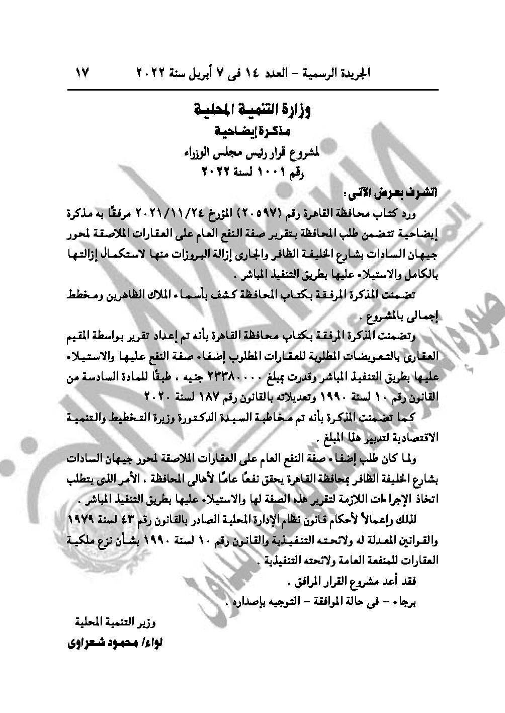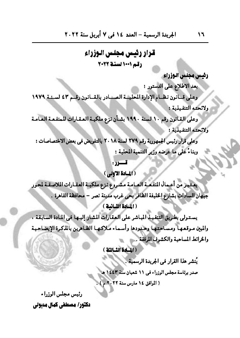 نشرت الجريدة الرسمية في عددها رقم 14، الصادر في 7 إبريل 2022، قرار رئيس مجلس الوزراء الدكتور مصطفى مدبولي رقم 1001 لسنة 2022، باعتبار مشروع نزع ملكية العقارات الملاصقة لمحور جيهان السادات بمدينة نصر من أعمال المنفعة العامة.