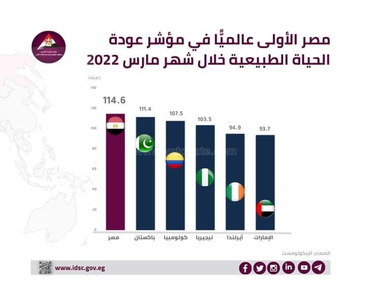 ومن بين 50 دولة، احتلَّت مصر المركز الأول في مؤشر عودة الحياة الطبيعية الصادر عن مجلة "الإيكونومست" خلال مارس 2022، مسجِّلَة 114.6 نقطة، مقارنةً بالمركز الـثاني خلال شهر فبراير 2022.