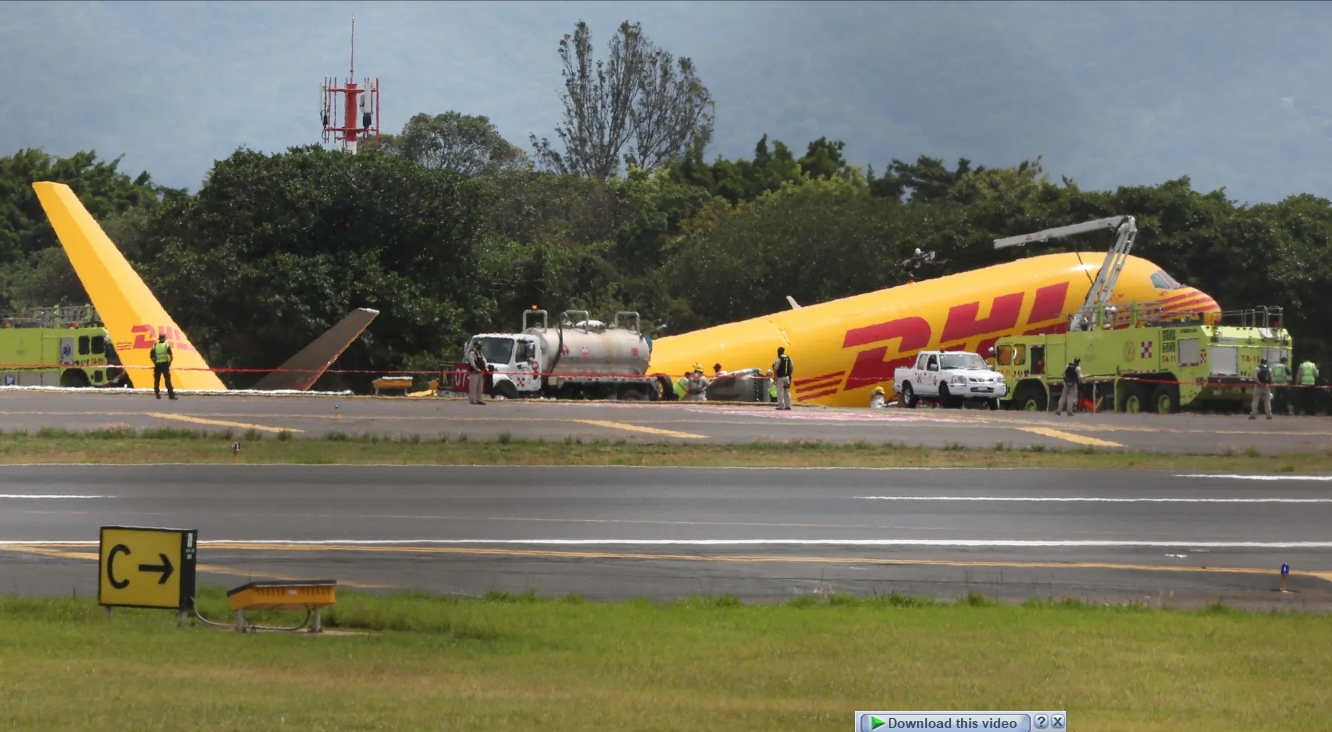 تعرَّضت طائرة شحن للبريد والطرود إلى حادثة غريبة عندما انشطرت إلى جزأين خلال هبوط اضطراري على مدرج مطار خوان سانتاماريا في سان خوسيه في كوستاريكا أمس الخميس.