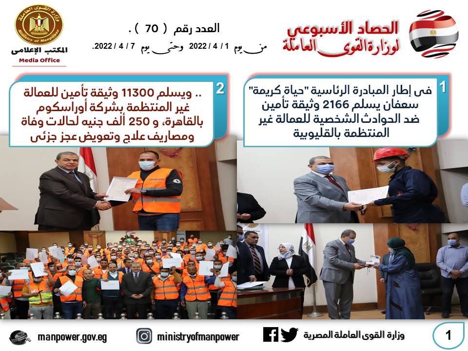 وفيما يلي تفاصيل ما جاء بالحصاد الأسبوعي، حيث سلّم محمد سعفان وزير القوى العاملة، بديوان عام الوزارة 2166 وثيقة تأمين ضد الحوادث الشخصية للعمالة غير المنتظمة المسجلة بمديرية القوى العاملة بمحافظة القليوبية، تغطي الوفاة، والعجز الكلى المستديم، والجزئي، تنفيذا لمبادرة "حياة كريمة"، التي أطلقها الرئيس عبد الفتاح السيسي ، وفي إطار تطبيق استراتيجية الوزارة لحماية ورعاية العمالة ومساندة هذه الفئة لرعايتهم اجتماعيا وصحيا وتأمينيا، من خلال إنشاء قاعدة بيانات سليمة، وذلك بحضور إيمان السيد شحاتة مدير المديرية، وحمدي جابر وكيل الوزارة للتشغيل، ومجدي عبد العزيز مدير عام الإدارة العامة للعمالة غير المنتظمة، ومحمد عليان وكيل المديرية، والمهندسة ياسمين ممدوح مدير عام الإدارة العامة للتخطيط ومتابعة التدريب المهني.
