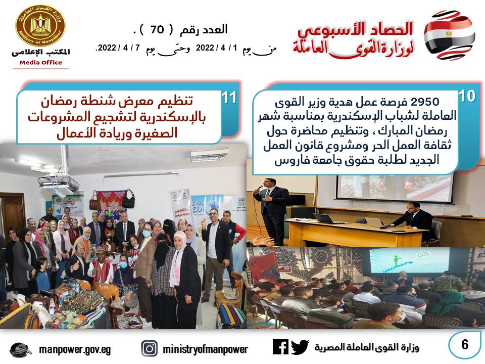 كما أهدي وزير القوي العاملة شباب الإسكندرية 2950 عمل منها 200 فرصة عمل لـ "قادرون باختلاف" وذلك بمناسبة شهر رمضان المبارك، مقدمة ٣٣ شركة في القطاع الخاص والاستثماري بالمحافظة، من خلال ملتقى التوظيف الذي نظمته مديرية القوى العاملة بالإسكندرية بعنوان :"الإسكندرية بلا بطالة"، وذلك في إطار مبادرة القيادة السياسية "حياة كريمة" لتوفير فرص عمل للشباب، ولائقة لمتحدي الإعاقة، والفئات المجتمعية الأكثر احتياجًا ودمجهم في المجتمع والاستفادة من قدراتهم .