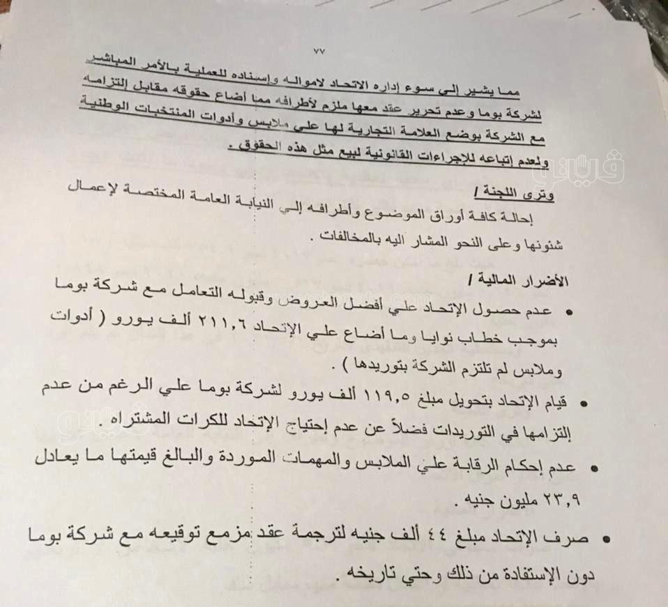 وأكد المستند أنه لا يوجد إحكام رقابة على الملابس والمهمات الموردة للاتحاد والمبالغ قيمتها 24 مليون جنيه.