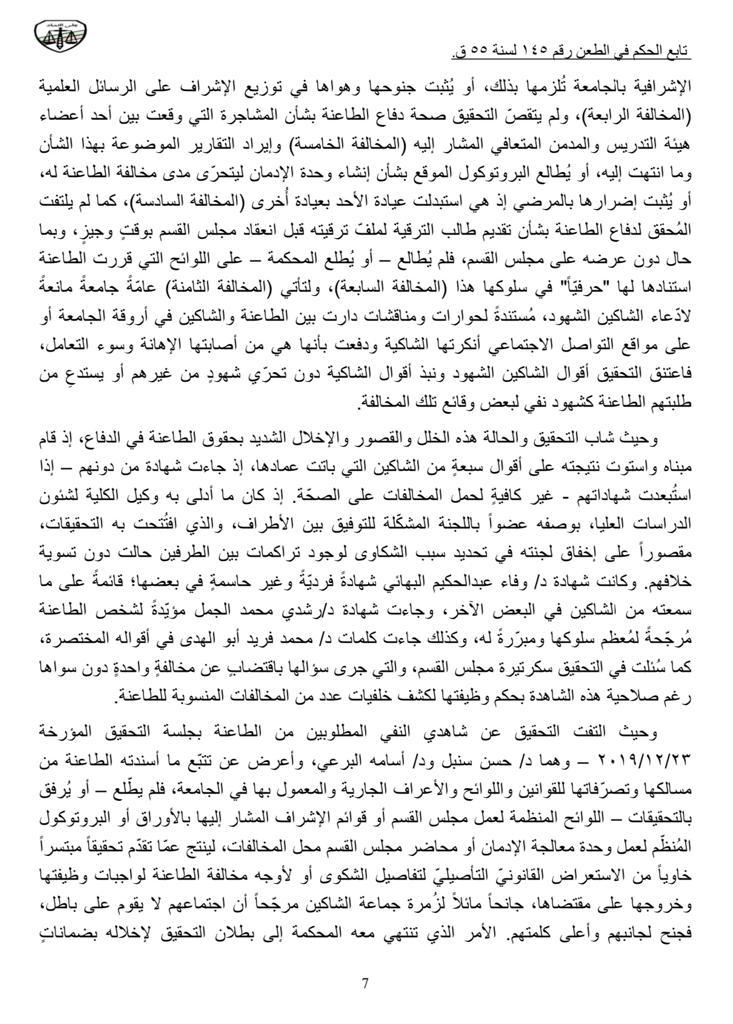 كما لم يلتفت المُحقق لدفاع الطاعنة بشأن تقديم طالب الترقية لملفّ ترقيته قبل إنعقاد مجلس القسم بوقتٍ وجيزٍ، فلم يُطلع المحكمة على اللوائح التي قررت الطاعنة إستنادها لها في سلوكها، ولتأتي المخالفة الأخيرة عامّةً جامعةً مانعةً لادّعاء الشاكين الشهود، مُستندةً لمناقشات دارت بين الطاعنة والشاكين في أروقة الجامعة أو على مواقع التواصل الاجتماعي أنكرتها الشاكية ودفعت بأنها هي من أصابتها الإهانة وسوء التعامل، فاعتنق التحقيق أقوال الشاكين الشهود ونبذ أقوال الشاكية الخصم، ودون تحرّي شهودٍ من غيرهم أو يستدعِ من طلبتهم الطاعنة كشهود نفي