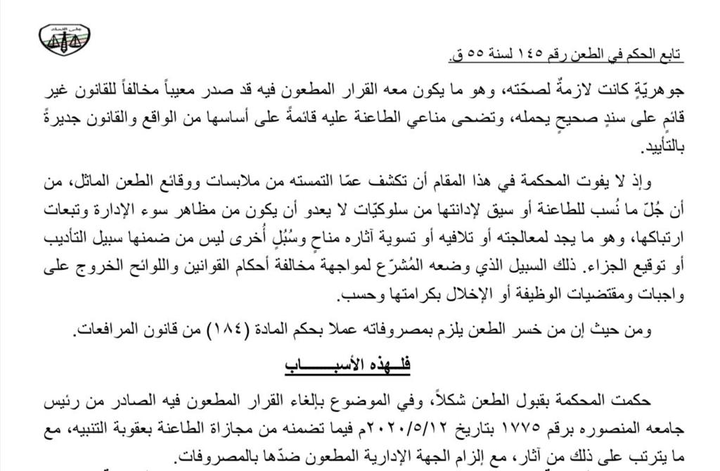 وصدر قرار رئيس الجامعة بمجازاة رئيس قسم الأمراض النفسية بالكليّة بعقوبة "اللوم"، لإخلالها بواجبات بوظيفتها، فتظلّمت من القرار، فأصدر رئيس الجامعة قراره بالاكتفاء بعقوبة التنبيه، فأقامت الطعن رقم 145 لسنة 55 قضائية ضد رئيس الجامعة المنصورة وآخرين لإلغاء قرار مجازاتها