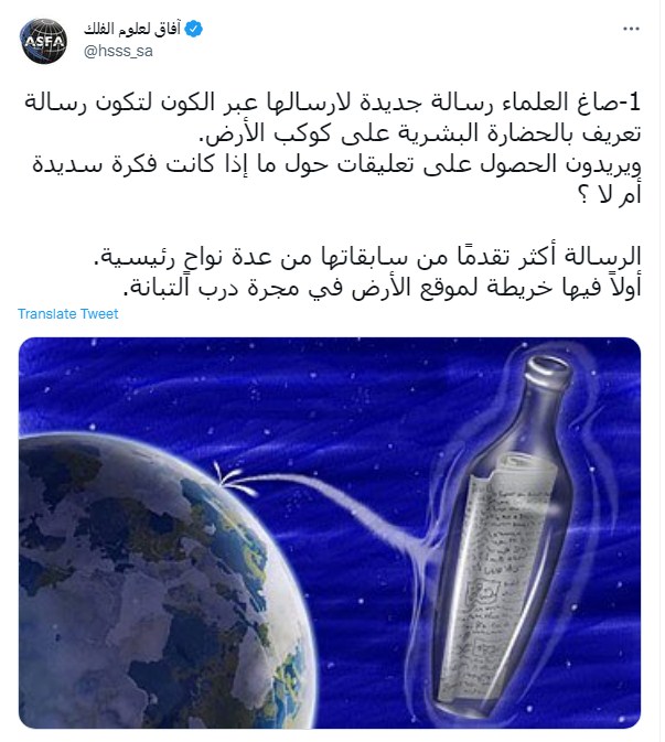 وكتبت الجمعية السعودية "آفاق لعلوم الفلك" تغريدة بتويتر قالت فيها: "صاغ العلماء رسالة جديدة لارسالها عبر الكون لتكون رسالة تعريف بالحضارة البشرية على كوكب الأرض. ويريدون الحصول على تعليقات حول ما إذا كانت فكرة سديدة أم لا؟ الرسالة أكثر تقدمًا من سابقاتها من عدة نواحٍ رئيسية. أولًا فيها خريطة لموقع الأرض في مجرة درب التبانة."