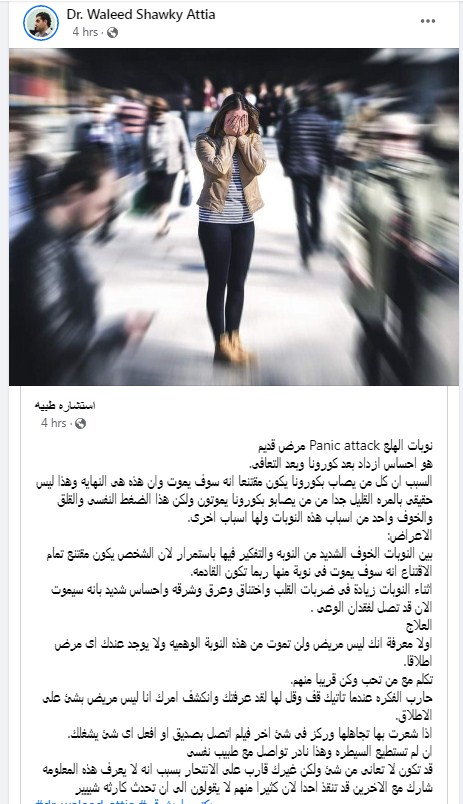وكتب الدكتور وليد شوقي تدوينة على الفيس بوك "نوبات الهلع Panic attack مرض قديم هو إحساس ازداد بعد كورونا وبعد التعافي".
