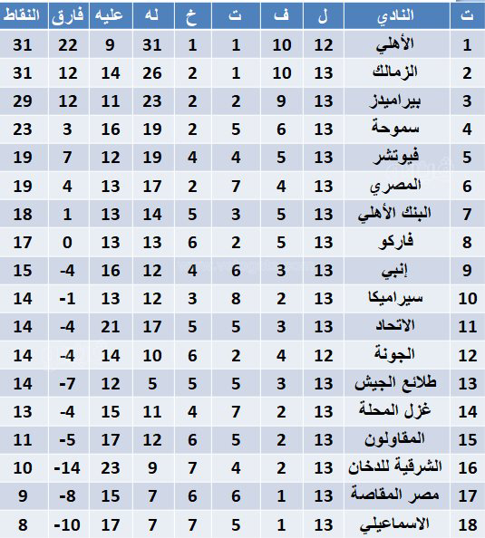 ويتصدر الأهلي جدول ترتيب الدوري الممتاز برصيد 31 نقطة ويليه الزمالك برصيد 31 نقطة ثم بيراميدز ثالثًا برصيد 29 نقطة بعد ختام الجولة الـ 13 لمسابقة الدوري الممتاز ولكن يتبقي للأحمر لقاء مؤجل مع الجونة.