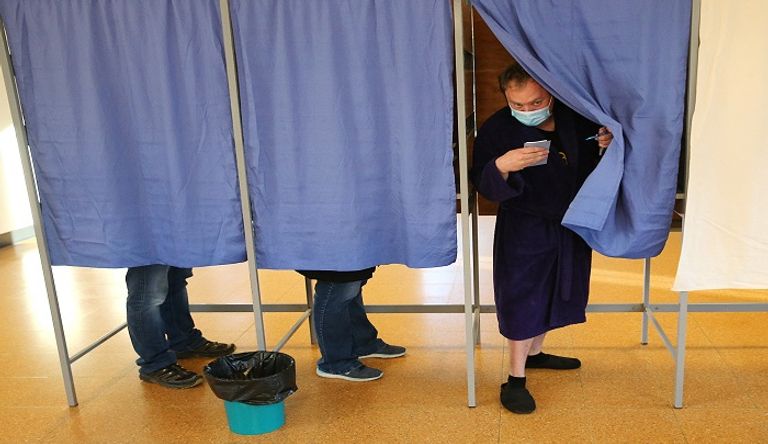 مجموعة صور لوكالة الأنباء الفرنسية أظهرت الناخب مرتديا كمامته وسعيدا بظهوره بـ"لوك مختلف" عن الناخبين خلال الجولة الأولى من الانتخابات.