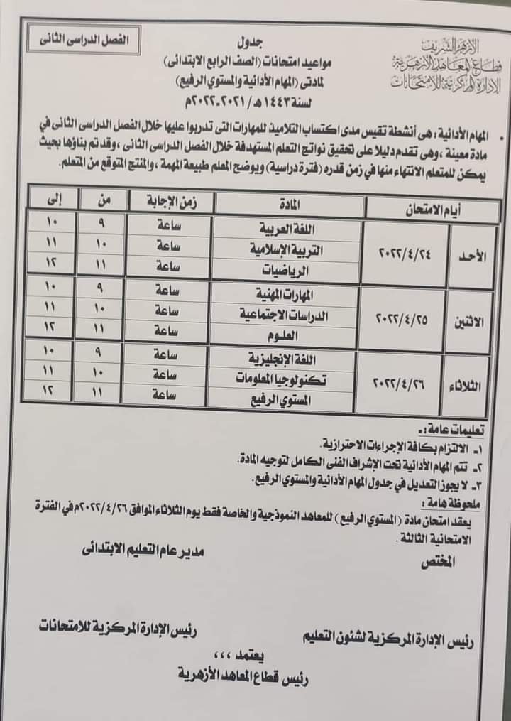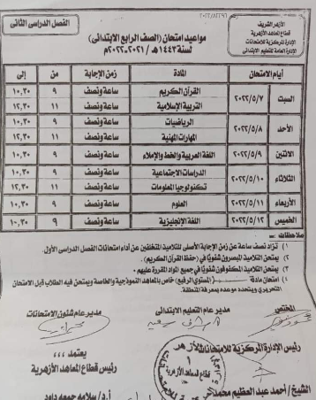 وكان قطاع المعاهد الأزهرية قد أعلن في وقت سابق عن جدول امتحانات نهاية العام للصف الرابع الإبتدائي الأزهري وذلك على النحو التالي: