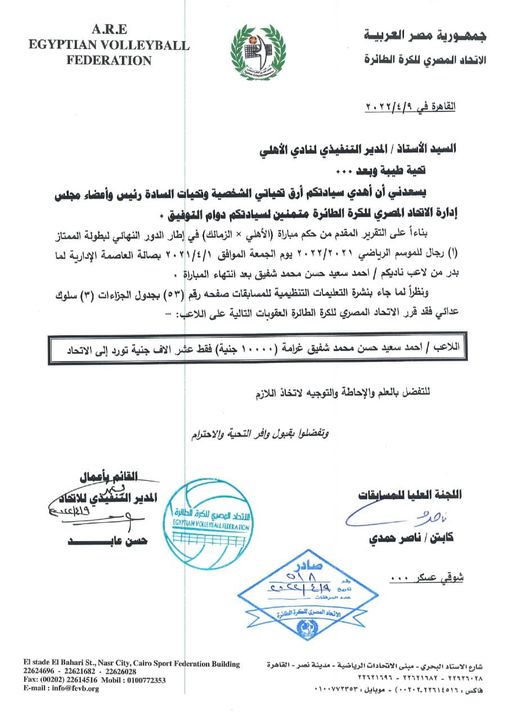 قرر مسئولو اتحاد الكرة الطائرة برئاسة ياسر قمر، تغريم أحمد سعيد لاعب الفريق الأول رجال بالنادي الأهلي مبلغ قدره 10 ألاف جنيه، بسبب التصرفات التي ارتكبها عقب انتهاء مباراة فريقه أمام نادي الزمالك في نصف نهائي الدوري.