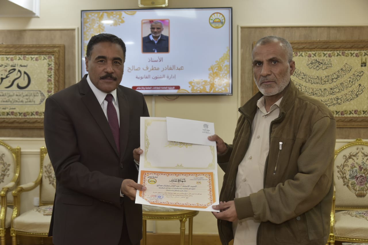 وكرم اللواء خالد شعيب محافظ مطروح، صباح اليوم الاثنين، فى احتفالية سادتها أجواء البهجة والعرفان بالجميل عددا من المحالين للمعاش بديوان عام المحافظة بعد بلوغهم السن القانونية بحضور عددا من مديري الإدارات وأسر المكرمين وذلك بديوان عام المحافظة.