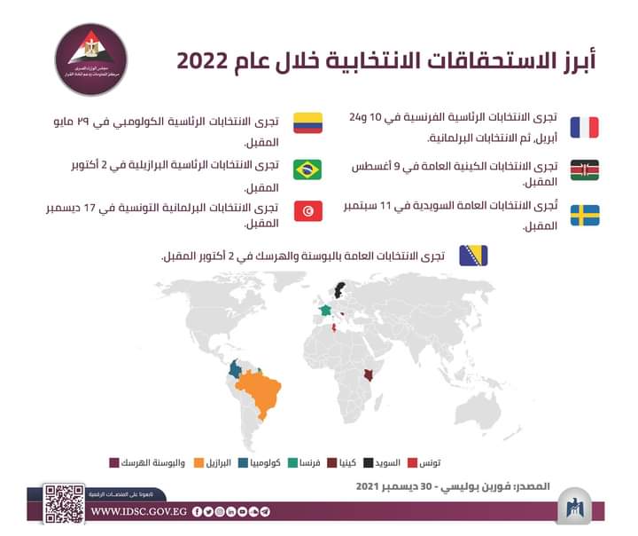 نشر مركز المعلومات ودعم اتخاذ القرار بمجلس الوزراء عبر صفحته الرسمية على موقع التواصل الاجتماعي فيسبوك، إنفوجراف، بشأن أبرز الاستحقاقات الانتخابية خلال عام 2022.