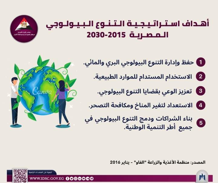 نشر مركز المعلومات ودعم اتخاذ القرار بمجلس الوزراء عبر صفحته الرسمية على موقع التواصل الاجتماعي فيسبوك، إنفوجراف، بشأن أهداف استراتيجية التنوع البيولوجي 2015-2030.
