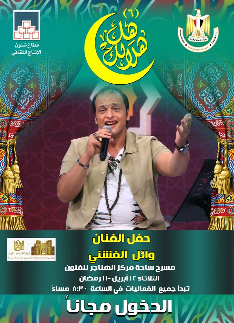 حيث يعيش الجمهور فى الليلة الثانية من برنامج هل هلالك، مع صوت الفنان "وائل الفشنى"، الذى يتغنى بباقة من الأغاني الدينية التى تحتل مكانة كبيرة فى قلوب المصريين، كما يشدو بأشهر أعماله الغنائية التى نالت نجاحا كبيرا خلال الفترة الماضية.