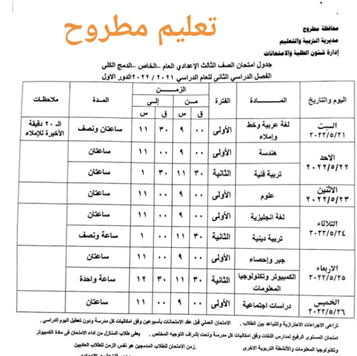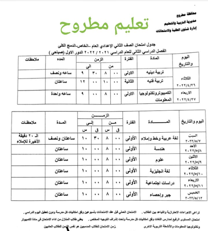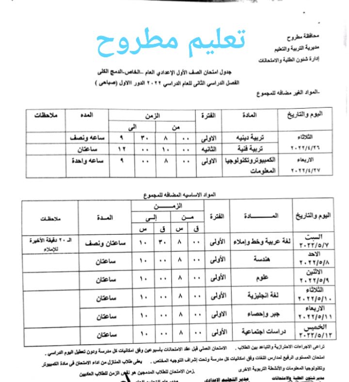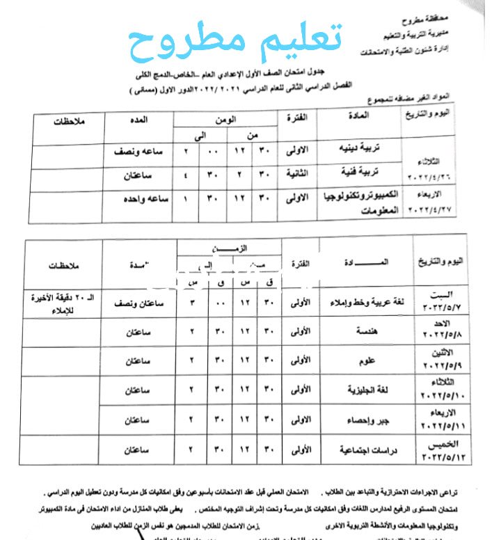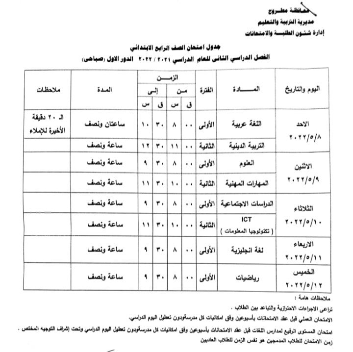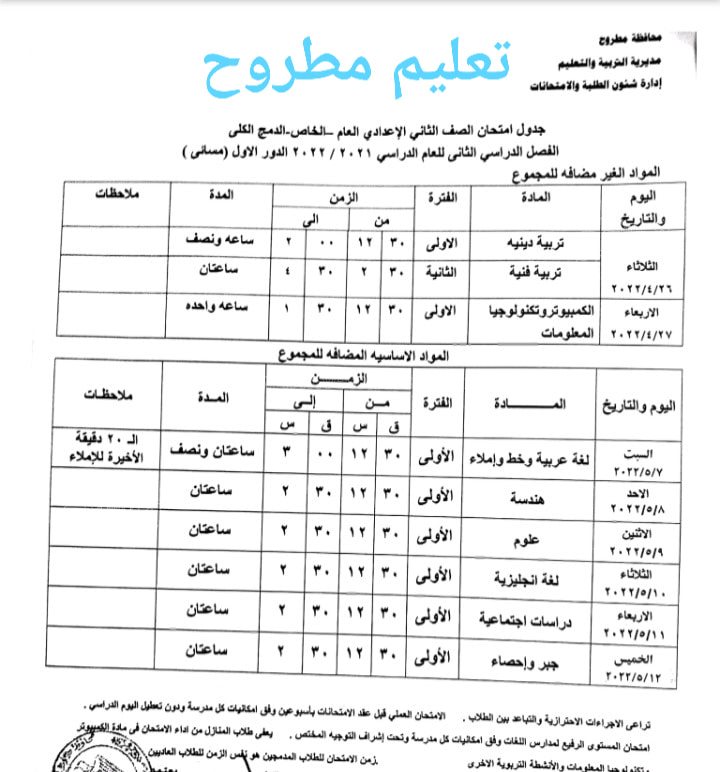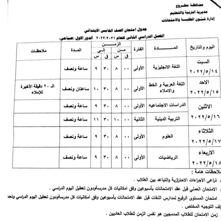 ننشر جداول امتحانات الترم الثاني لكافة المراحل التعليمية بمطروح