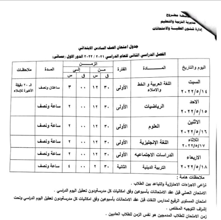 ومن المقرر أن تبدأ إمتحانات الصف الرابع (عام - خاص - دمج مجتمعى وتربية خاصة) من ٨ إلى ١٢ مايو ٢٠٢٢/٢٠٢١ حسب جدول امتحانات الوزارة والصف الخامس والسادس ابتدائي (عام ومجتمعي) من ١٤ إلى ١٨ مايو والصف السادس والسابع والثامن صم من ١٤ إلى ١٨ مايو ٢٠٢٢، وامتحانات الصف الأول والثاني والثالث ( مجتمعى ) من ٨ إلى ١٠ مايو ٢٠٢٢.