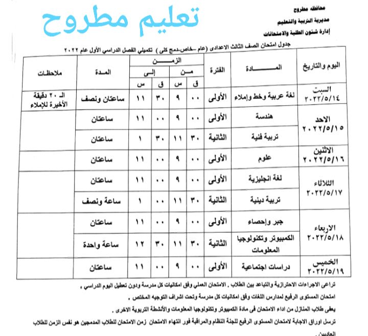 وبالنسبة لامتحانات المرحلة الإعدادية الصف الأول والثاني الإعدادي في الفترة من ٧ إلى ١٢ مايو ٢٠٢٢ والمواد الغير اساسية للصفين الأول والثاني الإعدادي العام يومي ٢٦ و٢٧ إبريل ٢٠٢٢ وامتحانات الصف الثالث الإعدادي في الفترة من ٢١ إلى ٢٦ مايو ٢٠٢٢ والصف الثالث التكميلي من ١٤ إلى ١٩ مايو ٢٠٢٢