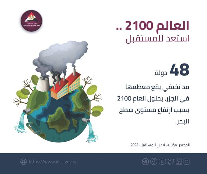 نشر مركز المعلومات ودعم اتخاذ القرار بمجلس الوزراء عبر صفحته الرسمية على موقع التواصل الاجتماعي فيسبوك، إنفوجراف، بشأن شكل الحياة في العالم عام 2100.