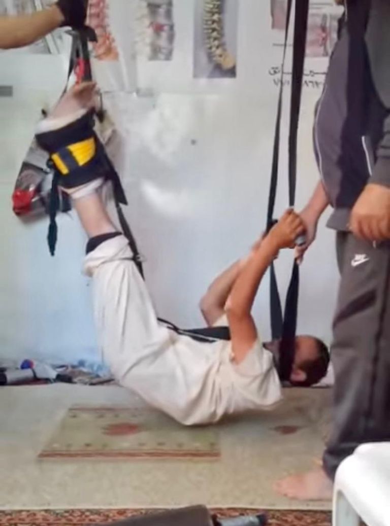 الفيديو يعود للمعالج الشعبي اليمني حسين الفائق، مالك مركز لعلاج آلام الظهر والعمود الفقري في شارع تعز بالعاصمة صنعاء الخاضعة لميليشيا الحوثي الإرهابية، حيث يجري هناك العلاج الطبيعي عبر جلسات تدريبية قاسية للمصابين.