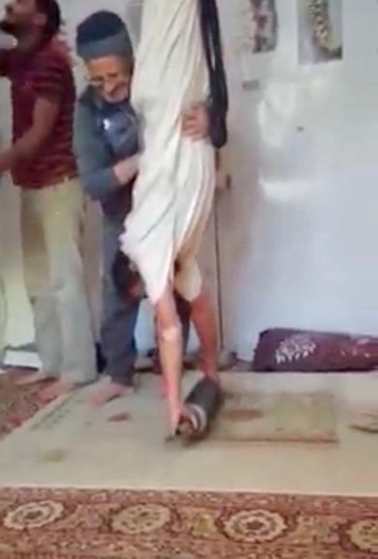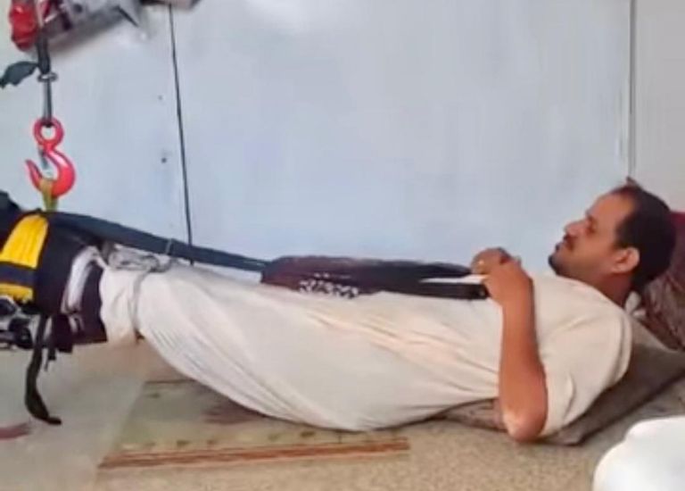 وتداول ناشطون يمنيون على نطاق واسع مقطع مصور، يظهر فيه معالج شعبي وهو يرفع رجلًا مصفد القدمين يشكو من آلام بالظهر بطريقة مرعبة، عبر آلة حديدية تجعل رأسه موجه نحو الأرض.