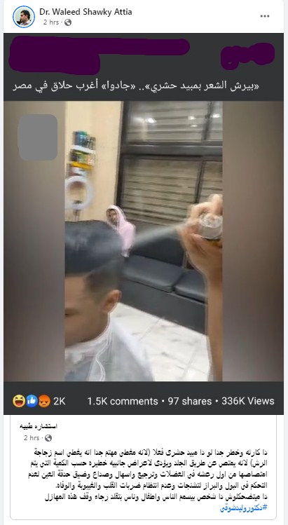وعلق وليد شوقي على الحلاق الذي يرش الشعر بمبيد حشري لتصفيفه فقال في تدوينة على الفيس بوك "دا كارثه وخطر جدًا، لو دا مبيد حشرى فعلًا (لأنه مغطى مهتم جدا انه يغطى اسم زجاجة الرش) لانه يمتص عن طريق الجلد".