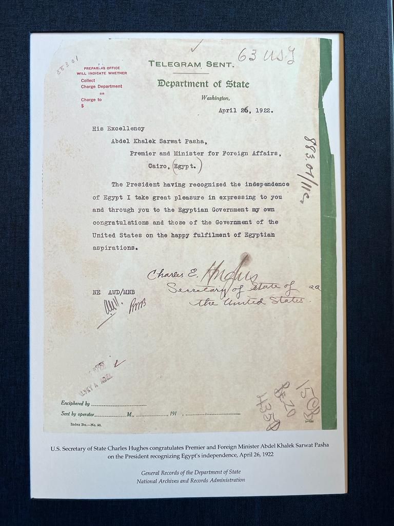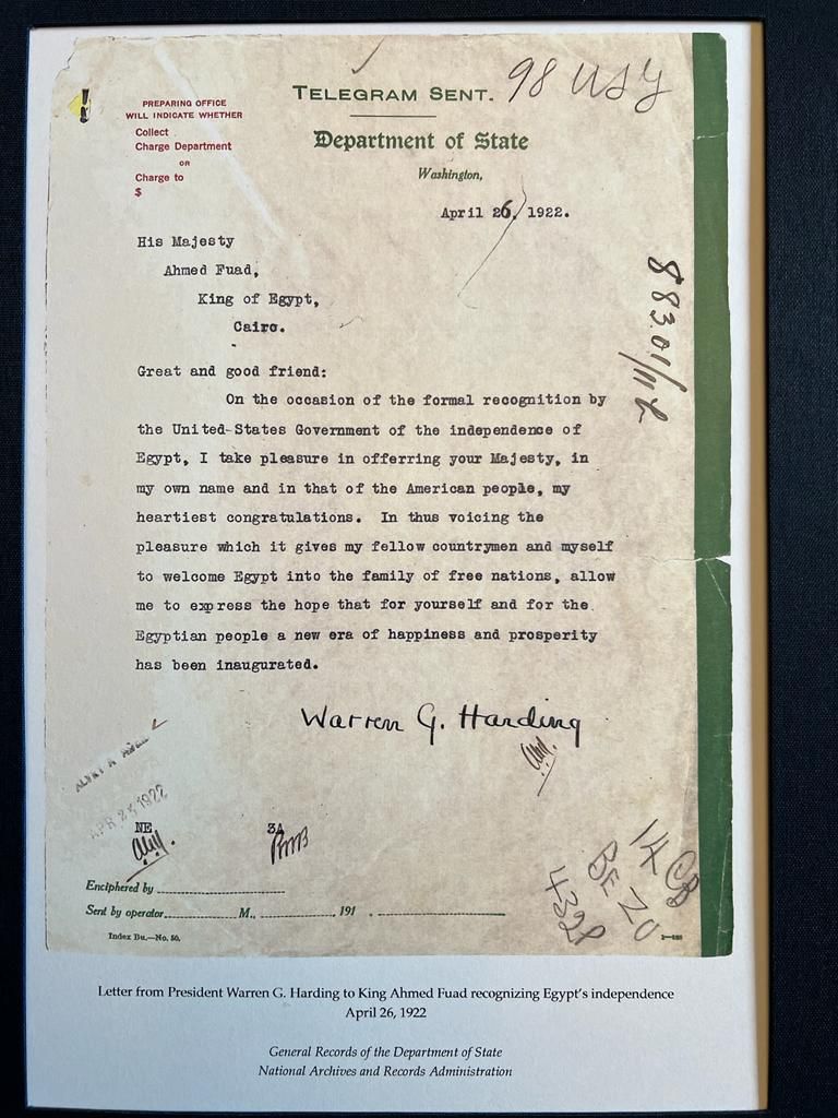 وكانت الهدية هي عبارة عن نسخة لخطابيّن؛ أحدهما خطاب الاعتراف باستقلال مصر وسيادتها والوثيقة المنشئة للعلاقات موجّهة من الرئيس الأمريكي آنذاك "وارن هاردينج" إلى الملك أحمد فؤاد، والآخر خطاب من وزير الخارجية الأمريكي في ذلك الوقت "تشارلز هيوز" إلى عبد الخالق ثروت باشا لتهنئته على الاستقلال.