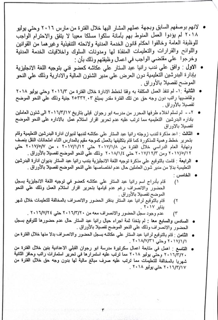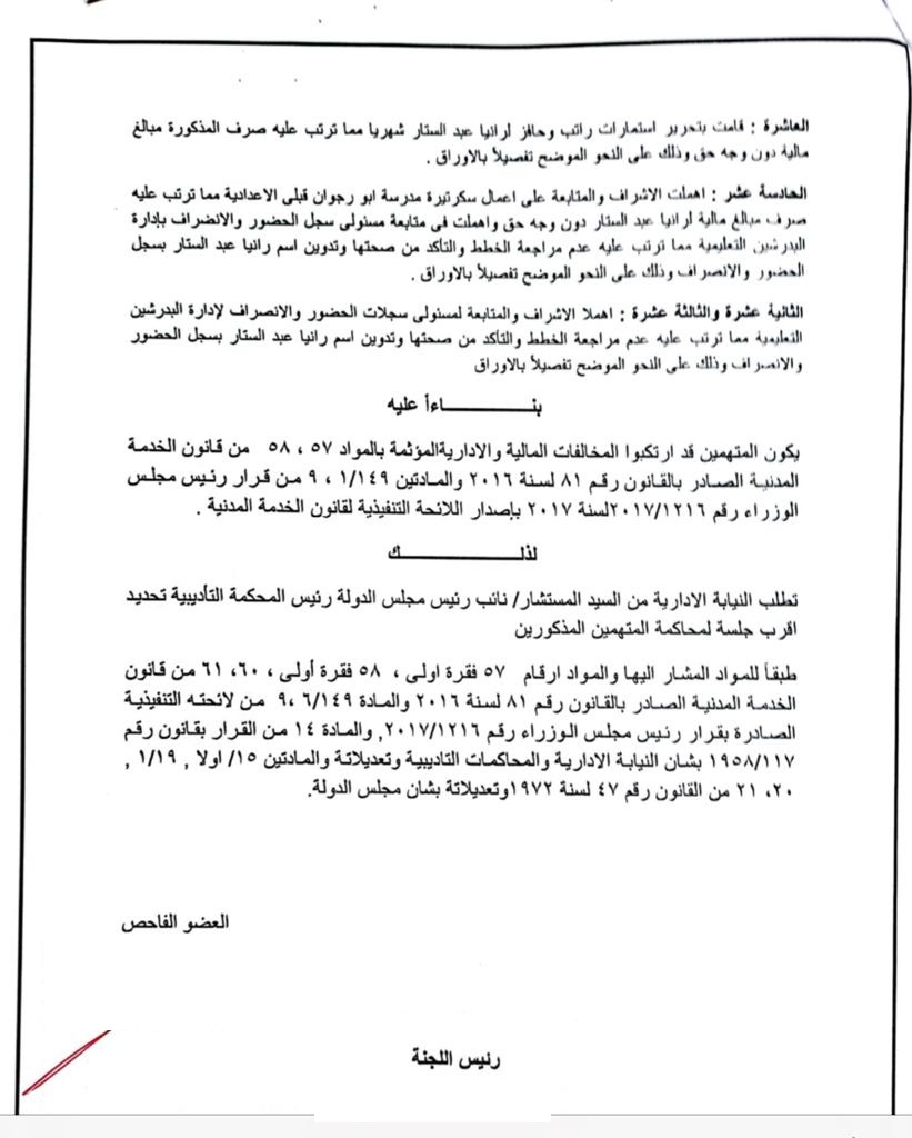 وأهمل محمد عبد العزيز أحمد، مدير مدرسة أبو رجوان قبلي الإعدادية في متابعة أعمال سكرتيرة المدرسة مما ترتب عليه إستمرارها في تحرير إستمارات راتب وحافز رانيا عبد الستار بدون وجه حق، وحررت منى سيد محمد، سكرتيرة مدرسة أبو رجوان قبلي الإعدادية إستمارات راتب وحافز رانيا عبد الستار شهريًا مما ترتب عليه صرفها مبالغ مالية دون وجه حق