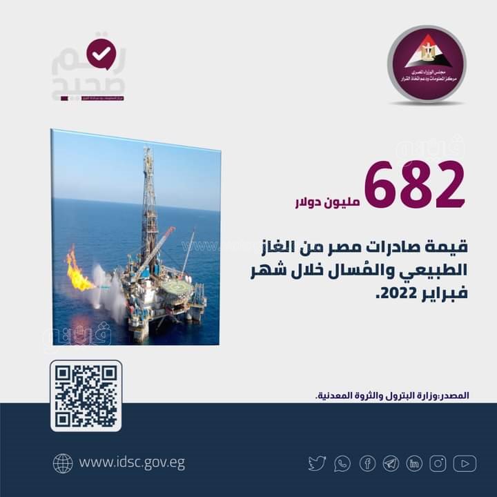 نشر مركز المعلومات ودعم اتخاذ القرار بمجلس الوزراء عبر صفحته الرسمية على موقع التواصل الاجتماعي فيسبوك، إنفوجراف، بشأن قيمة صادرات مصر من الغاز الطبيعي والمسال خلال فبراير 2022.