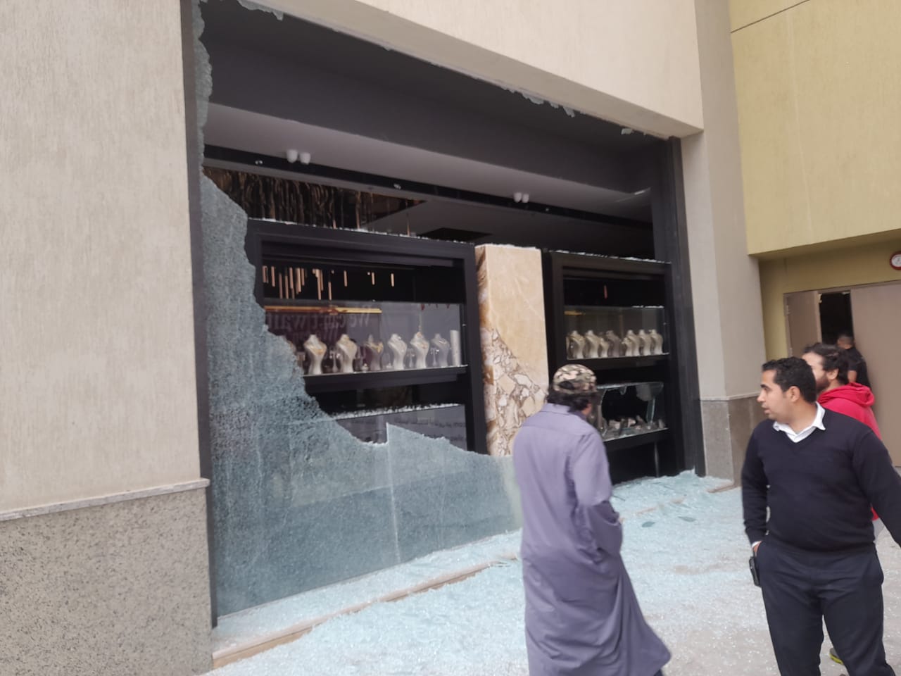 وبالفحص تبين تكسير فاترينة زجاجية باستخدام "أجنة حديدية" لمحل بيع المشغولات الذهبية بأحد الكمبوندات وسرقة كمية من المشغولات.