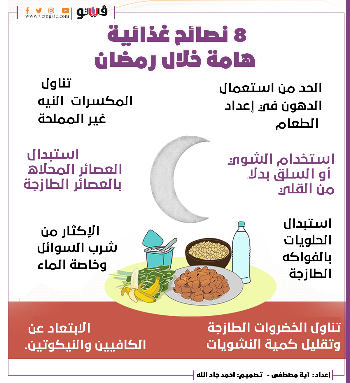 8 نصائح غذائية مهمة خلال رمضان | إنفوجراف الخميس 14/أبريل/2022 - 12:26 م 4/14/2022 12:26:55 PM ياميش رمضان آية مصطفى شارك طباعة 18 حجم الخط شارك طباعة شهر رمضان الدجاج المشوي الخضروات الطازجة العادات الغذائية تناول اللحوم الفواكه الطازجة
