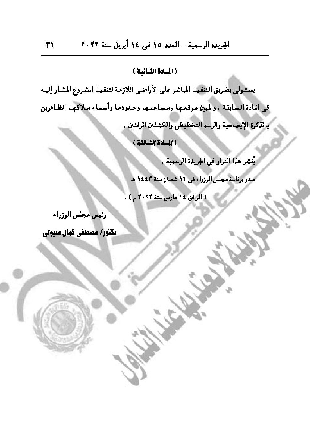 ويستولى بطريق التنفيذ المباشر على الأراضي اللازمة لتنفيذ المشروع، المبين موقعها ومساحتها وحدودها وأسماء ملاكها الطاهرين بالمذكرة الإيضاحية والرسم التخطيطي.