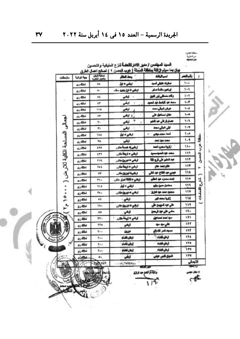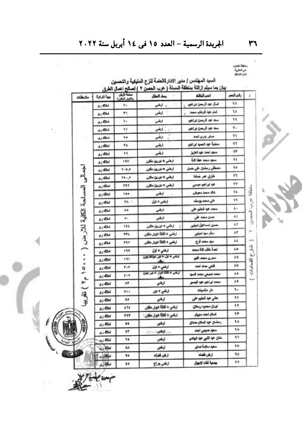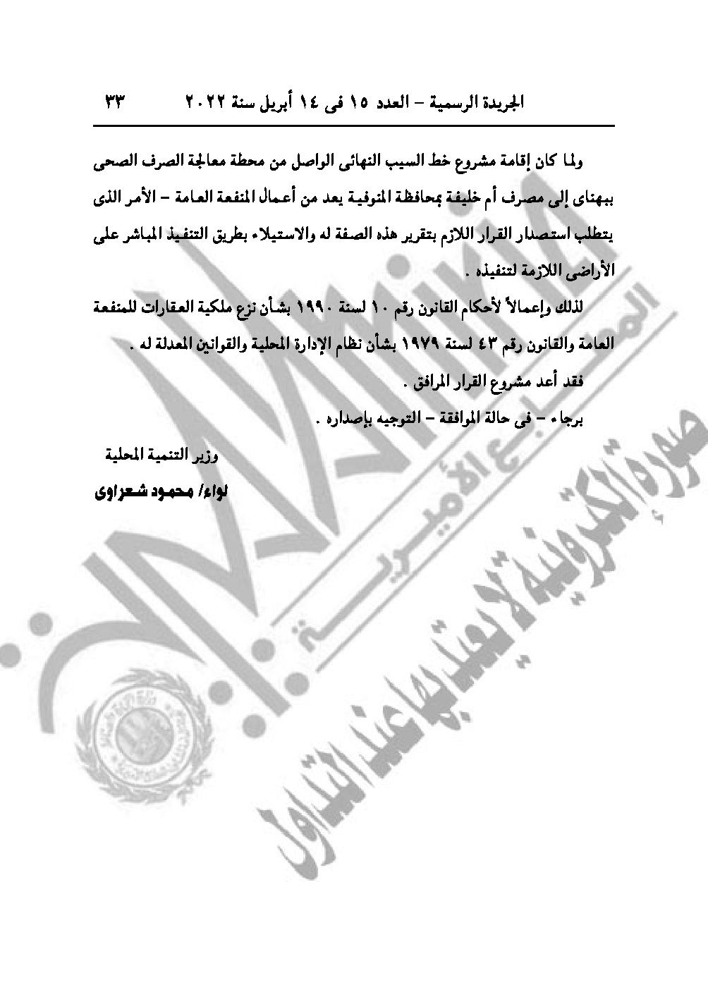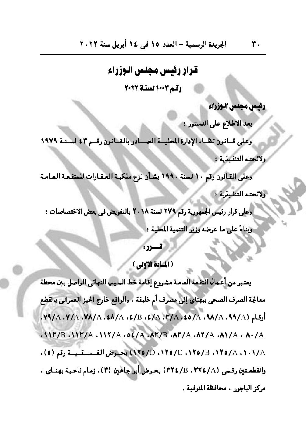 ونص القرار على أنه “يعتبر من أعمال المنفعة العامة مشروع إقامة خط السيب النهائى الواصل بين محطة معالجة الصرف الصحى ببهناى إلى مصرف أم خليفة، والواقع خارج الحيز العمرانى بالقطع أرقام (A99/، A98/، A45/، A3/، A4/، B4/، A48/، A78/، A7/، A79/، A80/، A81/، A82/، A83/، B83/، A54/، A112/، A113/، B113/، A101/، A125/، B125/، C125/، D125/) بحوض الفسقية رقم (5)، والقطعتين رقمى (A324/، B324/) بحوض أبو جاهين (3)، زمام ناحية بهنــاى، مركز الباجور، محافظة المنوفية”.