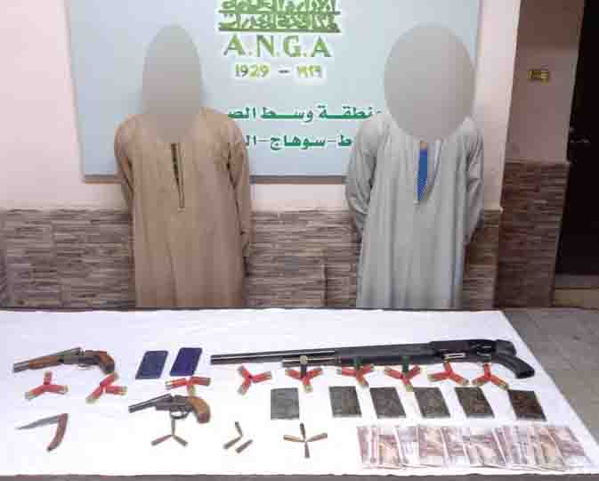 كما تم ضبط (6 طربة لمخدر الحشيش وزنت 600 جرام – بندقية خرطوش – فرد خرطوش – فرد محلى – عدد من الطلقات النارية – دراجة نارية بدون لوحات - سلاح أبيض "مطواة" – مبلغ مالى- 2 هاتف محمول) بحوزة (عنصرين من العناصر الإجرامية، لهما معلومات جنائية) حال تواجدهما بدائرة مركز شرطة أسيوط.