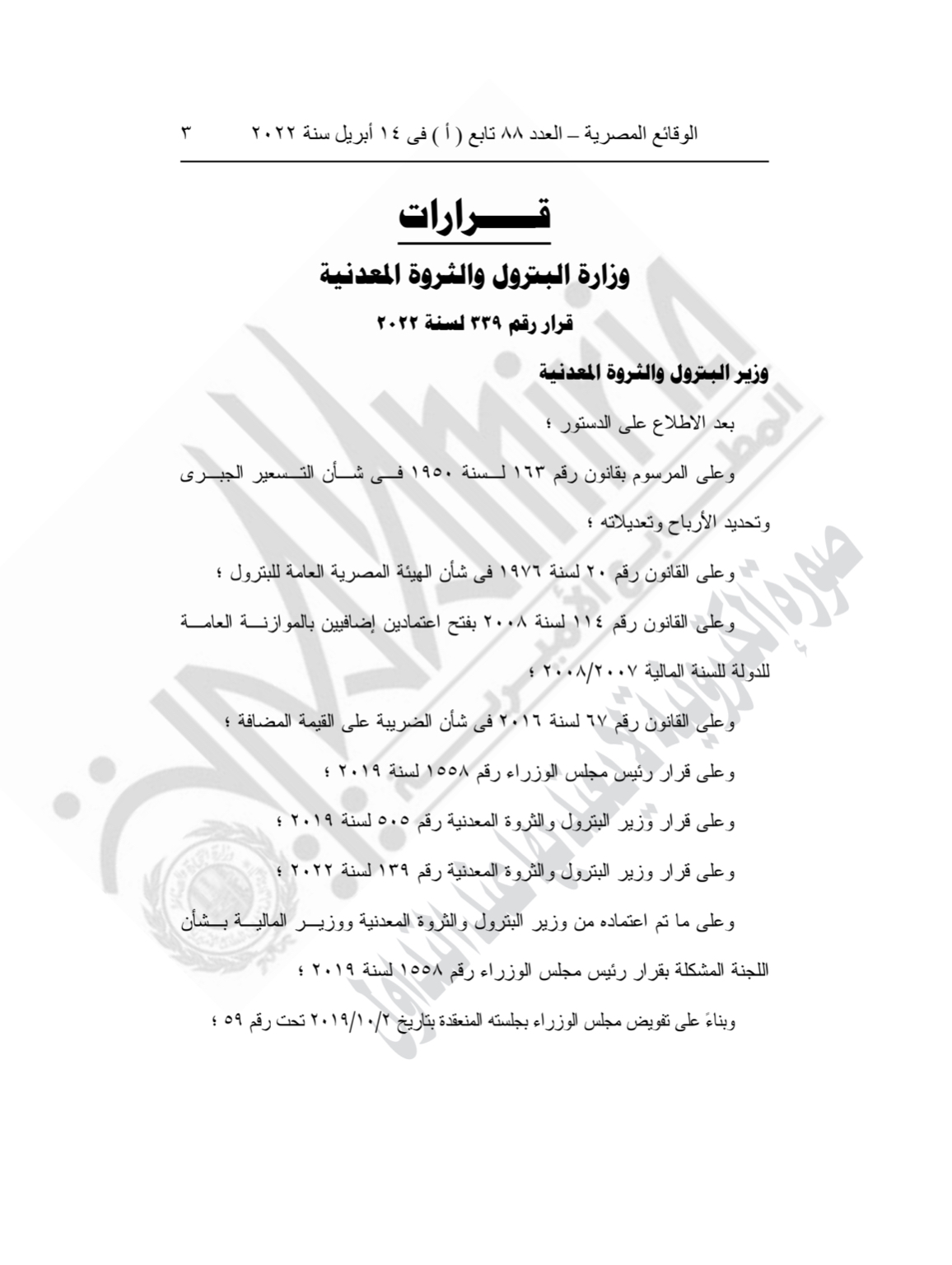 نشرت الجريدة الرسمية في عددها رقم 88، اليوم الجمعة، قراري المهندس طارق الملا وزير البترول والثروة المعدنية، رقم 339 لسنة 2022، ورقم 340 لسنة 2022 بشأن التسعير الجديد لأسعار الوقود.